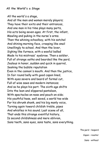 All the worlds a stage monologue spoken by jaques act 2 scene 7. They have their exits and their entrances and one man in his time plays many parts his acts being seven ages. The ability to change. They have their exits and their entrances and one man in his time plays many parts his acts being seven ages.